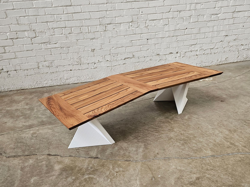 Designed by Model No., fabricated by me. Coffee table top made with salvaged elm; bases 3D printed with cellulose acetate.